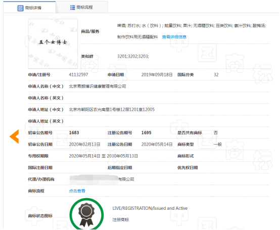 除化妆品(第3类)、医用营养品(第5类)是该公司产品宣传和使用所需要的类别外,32类饮料也是比较核心的类别了,所幸的是该公司成功注册该商标。