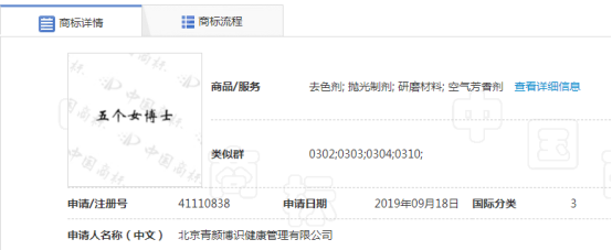 天眼查App显示,“五个女博士”关联公司北京青颜博识健康管理有限公司成立于2019年7月,该品牌背后公司北京青颜博识健康管理有限公司因发布低俗广告、虚假宣传的投诉举报,现已被北京市市场监督管理局立案调查,收集证据材料、约谈品牌方。以下是从商标局官网查询的该公司注册商标的情况: