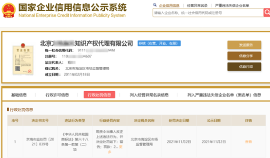 提醒大家:商标结果,一切以官方正式文件为准!近日,国家企业信用信息公示系统发布了一则行政处罚信息。北京一知识产权代理有限公司在商标局官网未曾下发正式驳回通知的情况下就通知申请人其申请商标被驳回,涉嫌以不正当手段扰乱商标代理市场秩序。北京市海淀区市场监督管理局现责令该公司改正违法行为,并决定处罚如下:警告;罚款:20000元。