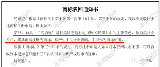 审查最快的,现在已经出结果了,经过商标局审查,认定“高启强”是扫黑除恶题材电视剧《狂飙》中的主要角色,作为黑社会头目,将其申请注册为商标,易产生不良社会影响,不得作为商标使用。