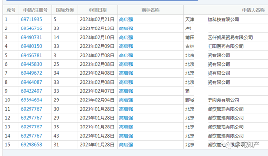 另外,电视剧中,主角“高启强”,也被人拿来申请。查了下,一共有15件。