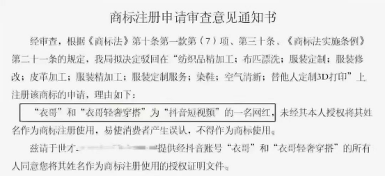 13、“衣哥”和“衣哥轻奢穿搭”为“抖音短视频”的一名网红,未经其本人授权将其姓名作为商标注册使用,易使消费者产生误认,不得作为商标使用。