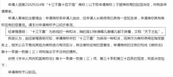 12、"十三不靠”为麻将的一种和法,指的是13张牌哪儿跟哪儿都不挨着,又称"天下大乱"我委认为,由经审理查明可知,申请商标中的“十三不靠”为麻将一种和法,将其作为商标使用在指定服务上,相关公众不易将其视为商标进行有效区分,缺之商标应有的显署性,申请商标的注册已构成《商标法》第十一条第一款第《三)项所指之不予注册的情形。
