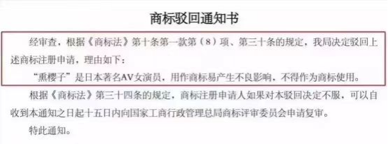 8、“熏樱子”是日本著名AV女演员,用作商标易产生不良影响,不得作为商标使用。