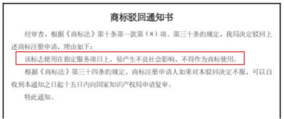 16、该标志使用在指定服务项目上,易产生不良社会影响。不得作为商标使用。