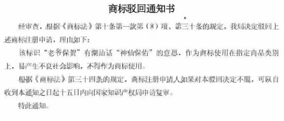 1、“老爷保贺”有潮汕话“神仙保佑”的意思,作为商标使用在指定商品类别上,易产生不良社会影响,不得作为商标使用。
