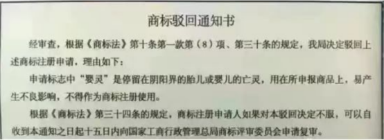 9、“婴灵”是停留在阴阳界的胎儿或婴儿的亡灵,用在所申报商品上,易产生不良影响,不得作为商标注册使用。