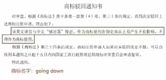 15、该英文读音与中文“够淫荡”接近,作为商标使用在指定商品上易产生不良影响,不得作为商标使用。