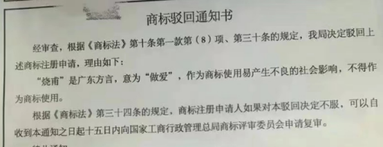 2、“烧甫”是广东方言,意为“做爱”,作为商标使用易产生不良的社会影响,不得作为商标使用。
