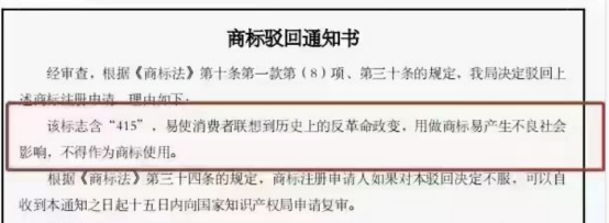 11、该标志含“415”,易使消费者联想到历史上的反革命政变,用做商标易产生不良社会影响,不得作为商标使用。