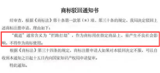 10、“截道”通常含义为“拦路打劫”,作为商标用在指定商品上,易产生不良社会影响,不得作为商标使用。