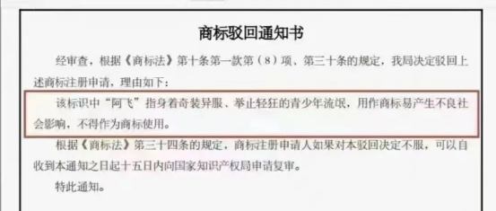 5、该标识中“阿飞”指身着奇装异服、举止轻狂的青少年流氓,用作商标易产生不良社会影响,不得作为商标使用。