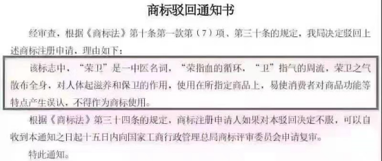 4、“荣卫”是一中医名词,“荣指血的循环,“卫”指气的周流,荣卫之气散布全身,对人体起滋养和保卫的作用,使用在所指定商品上,易使消费者对商品功能等特点产生误认,不得作为商标使用。