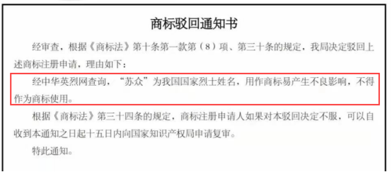 7、“苏众”为我国国家烈士姓名,用作商标易产生不良影响,不得作为商标使用。