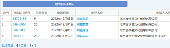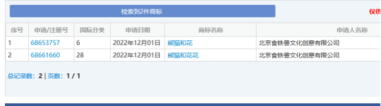 其中有关熊猫明星“花花”也被人注册申请商标,其中熊猫花花4件,熊猫和花2件,如下图: