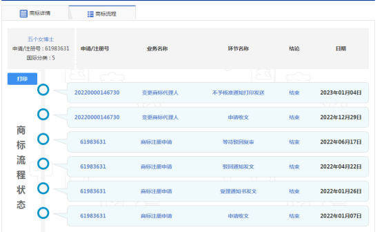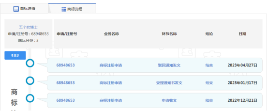 可见该公司在相关品牌经营的类目下注册了大量的商标,作为核心产品宣传特点和本文重点关注的商标应该是“五个女博士”在化妆品(第3类)、医用营养品(第5类)上的注册结果。然而这2个类的商标该公司申请过多次都被驳回过,最近一次驳回是2023年4月27日。